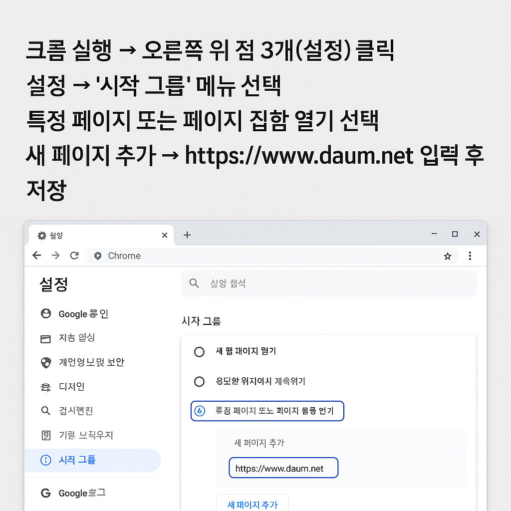 다음을 시작페이지로 설정하는 방법은 사용하는 **브라우저(인터넷 프로그램)**에 따라 조금씩 달라요. 아래에서 각 브라우저별로 아주 쉽게 정리해드릴게요!