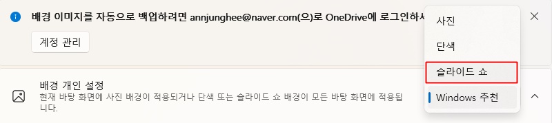 - 사진 슬라이드 쇼: 일정 시간마다 바탕화면이 자동으로 변경돼요