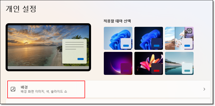 그리고 아래에서 배경으로 설정할 이미지를 선택하거나, 내 컴퓨터에 저장된 다른 사진을 선택할 수도 있어요. 클릭만 하면 바로 바뀌니까 너무 간단하죠?