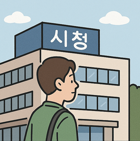 시민이 ‘시청’이라 적힌 건물로 들어가는 장면. 여권 창구에서 직원과 신청자가 대화하고 있으며, 벽에 시계가 걸려 있음.