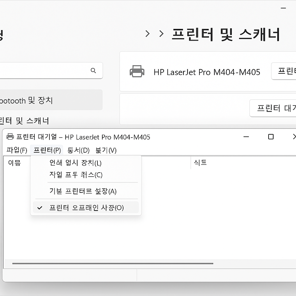 가장 흔한 원인 중 하나가 ‘프린터 오프라인 사용’ 옵션 활성화입니다.
