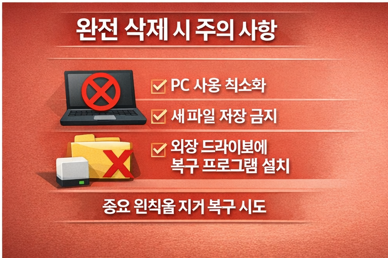 이 과정을 지키면 휴지통 삭제 파일 복원 성공률을 최대한 끌어올릴 수 있습니다.