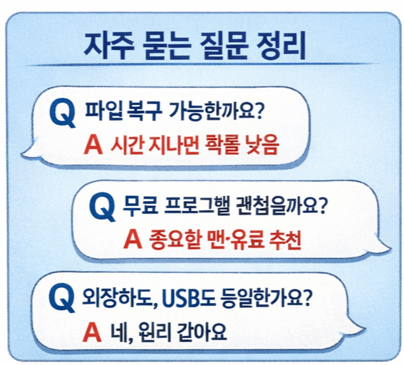 즉, SSD 환경에서는 삭제 사실을 인지한 즉시 행동을 멈추는 것이 무엇보다 중요합니다. 이 차이를 미리 알고 있다면 불필요한 기대나 시간 낭비를 줄일 수 있습니다.