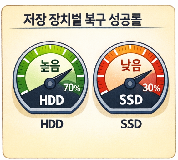 모든 저장 장치가 동일한 복구 결과를 보이는 것은 아닙니다. HDD의 경우 비교적 높은 확률로 복원이 가능하지만, SSD는 TRIM 기능으로 인해 삭제 후 빠르게 데이터가 정리될 수 있습니다.